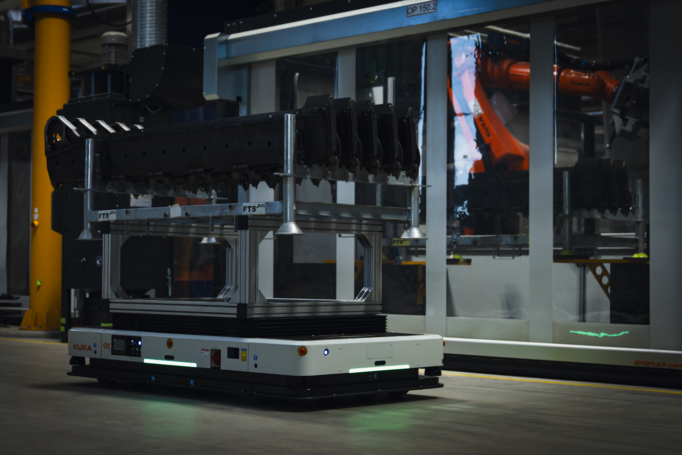 In a single production cell, nine welding and handling robots work synchronously with two machining centers and an automatic measuring cell. This has virtually eliminated downtime and allows production to be ramped up or scaled back flexibly. The first heavy-duty AMRs, such as the KMP 3000P, are also being tested in Ibbenbüren. It can move up to three tons in the production halls, twice as much in tandem, and move omnidirectionally with the highest precision even in the tightest of spaces.