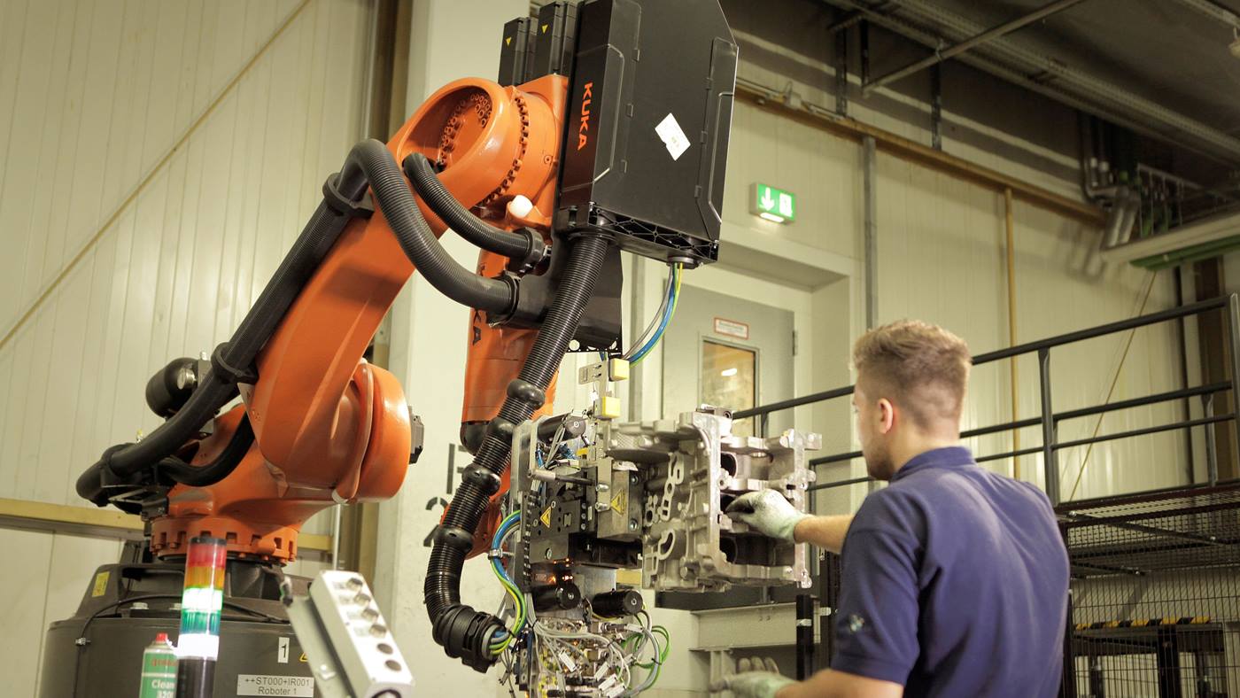 The BMW Group plant in Landshut operates one of the world’s most advanced foundries for light alloys. Crankshaft housings for all models of the BMW fleet are manufactured here – for three, four and six-cylinder engines. Quality assurance of the crankshaft housings cannot be fully automated, as these tasks still require the trained eye of the employees. For this reason, BMW opted for a system in which humans and robots directly collaborate. The company MRK-Systeme was tasked with the implementation. “Human-robot collaboration ensures that BMW employees are relieved of unergonomic tasks,” explains Michael Mohre, responsible for the Operations division at MRK-Systeme GmbH. For over a year and a half, two identical applications, each featuring a KUKA KR 210 R2900 prime K shelf-mounted robot from the KR QUANTEC series, have been operating on the production line in Landshut. At each station, an employee controls the robot motions with a joystick in order to check the components for defects, all the while maintaining a comfortable posture.