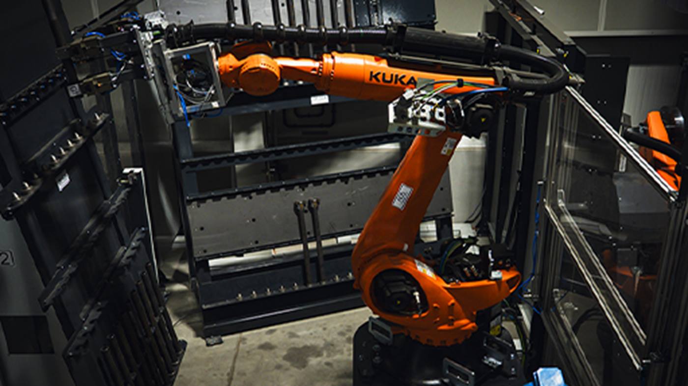 KUKA 搬运机器人早已在此等候 ,它从平台上取下压缩空气罐,随后将其送入加工单元,与其他部件一同完成焊接。
